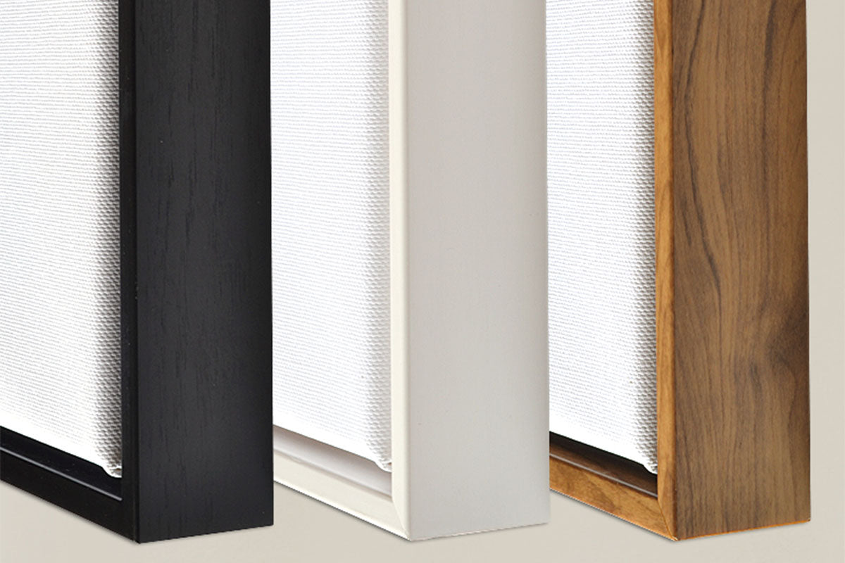 The frames are high quality wooden frames available in 3 colours (black, light oak and off white).