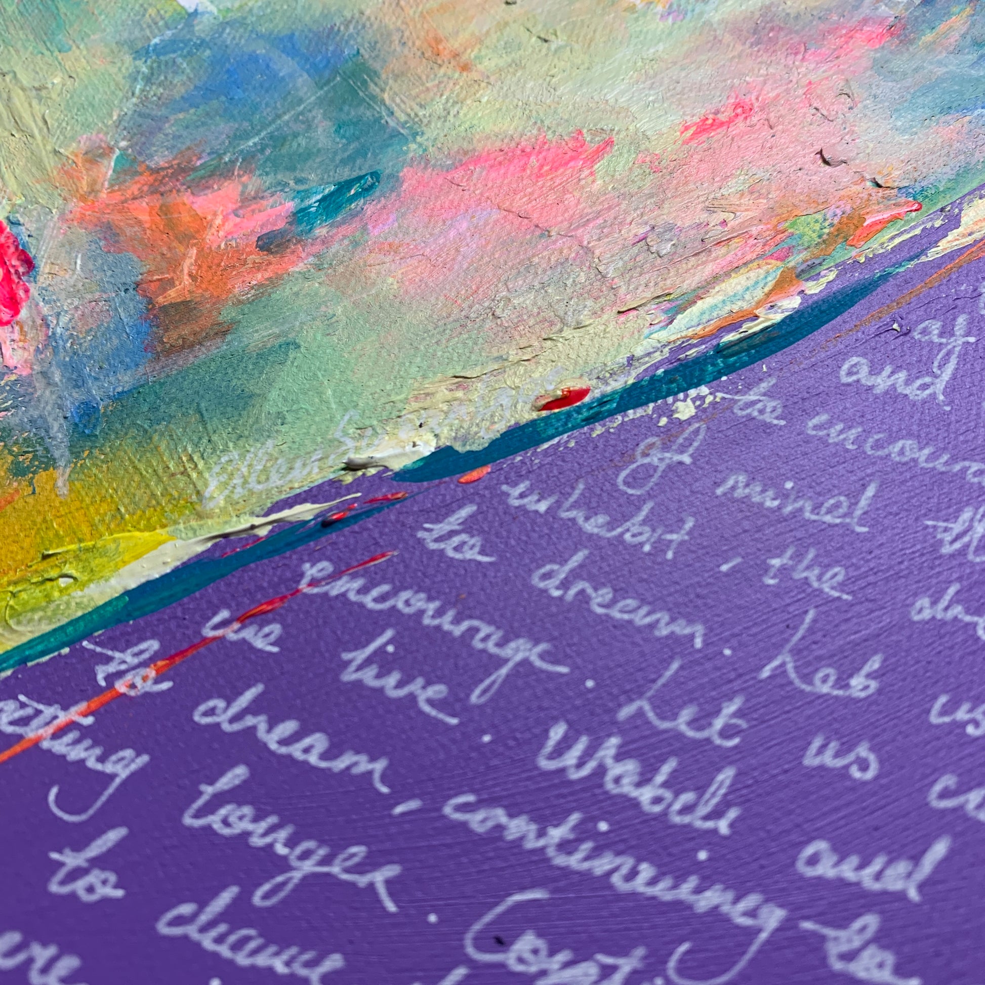 30x30cm original Acrylic painting on deep edge gesso primed canvas created using brushwork, my own writings and white pen.
